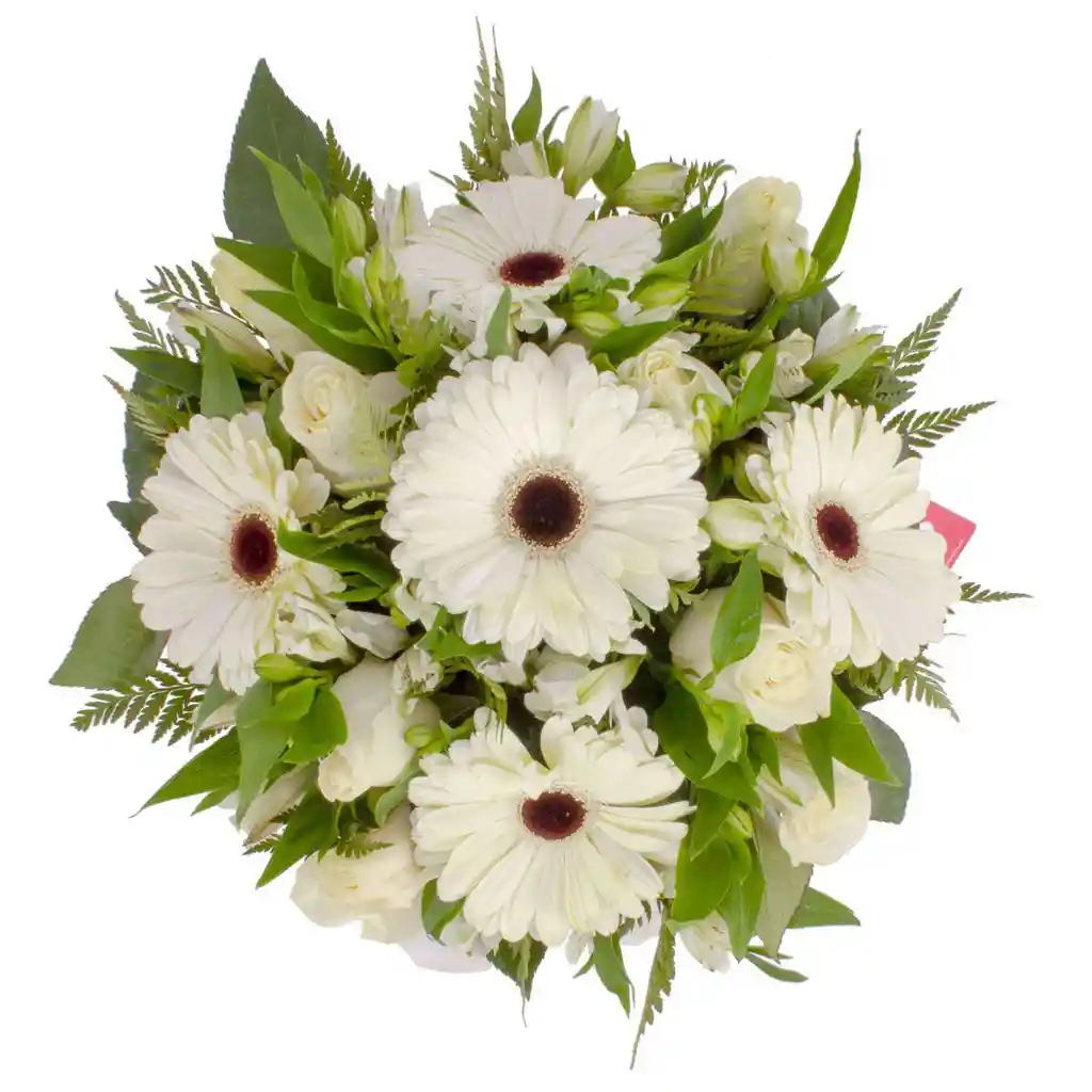Hermoso ramo con 6 rosas importadas, gerberas y astromelias en colores blancos envueltas en papel y cinta.