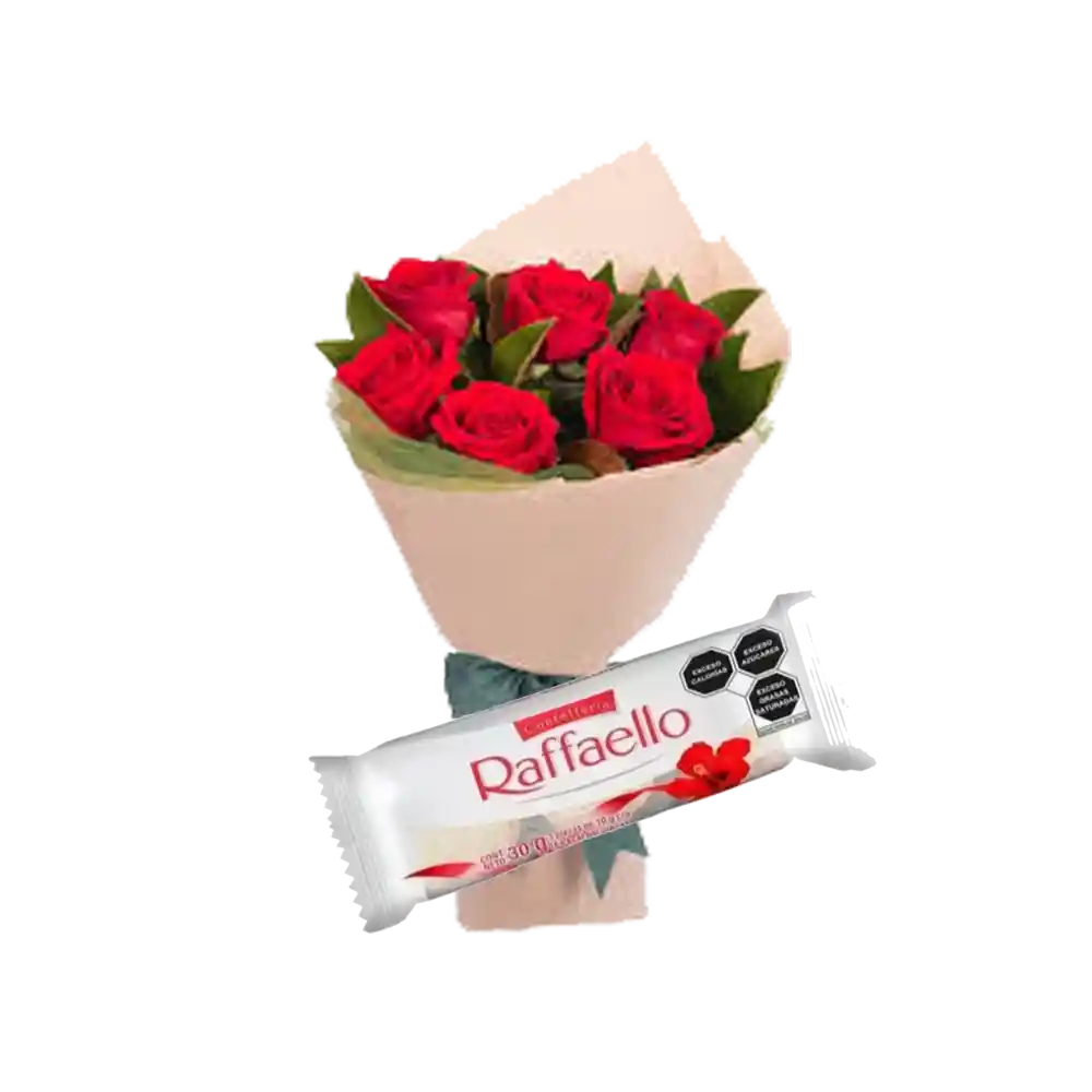 Hermoso ramo envuelto en papel y cinta con 6 rosas importadas en color rojo más bombones Raffaello de 3 unidades.