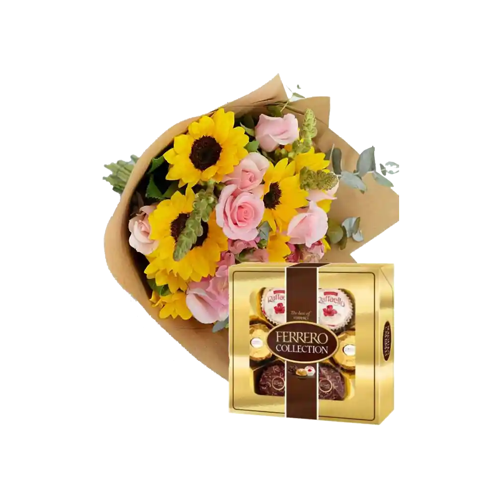 Hermoso ramo envuelto en papel y cinta con 6 Rosas Rosadas, 6 girasoles y ferrero rocher collection.