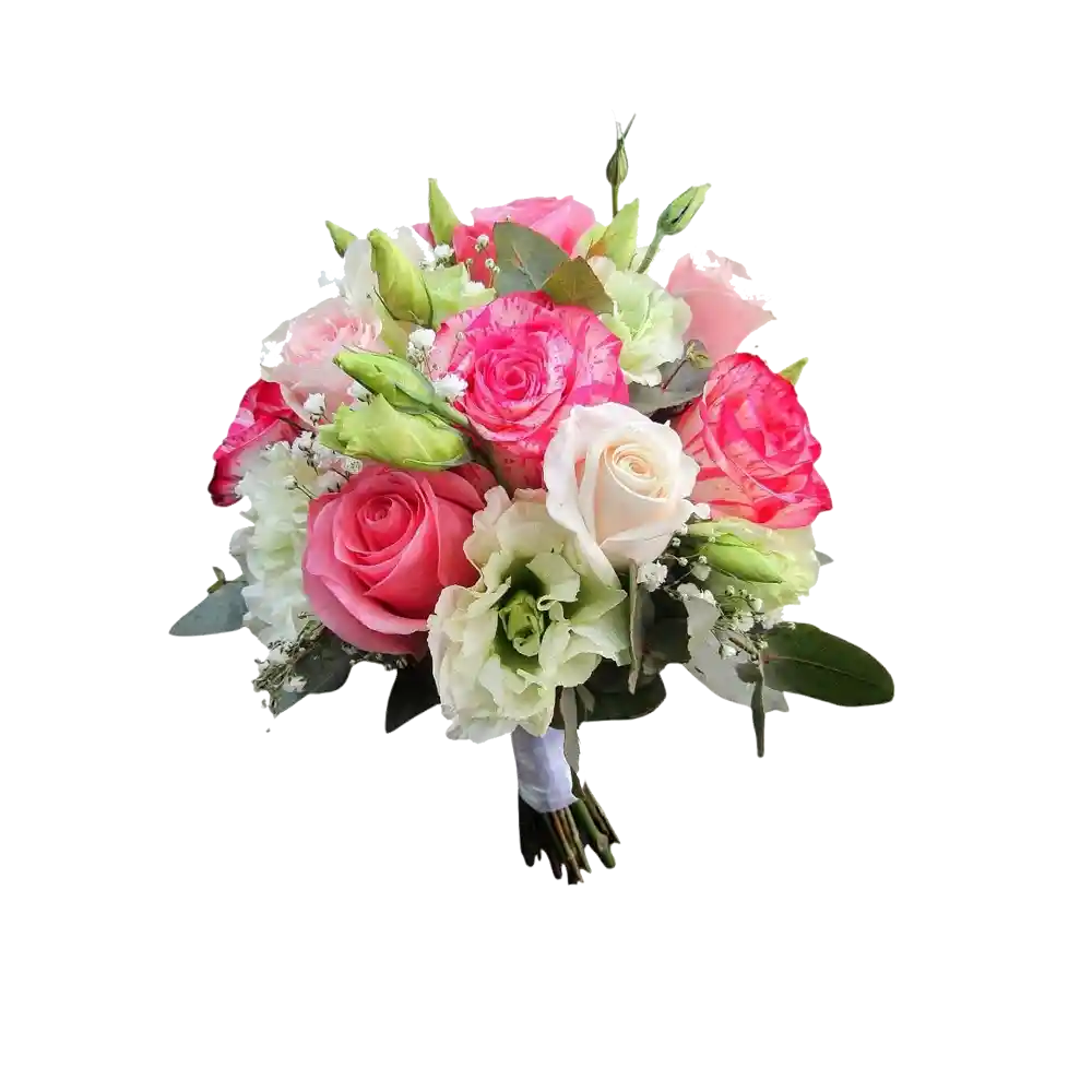 Hermoso ramo con 6 rosas y liisnathus en tonos rosados y blancos envuelto en papel y cinta.