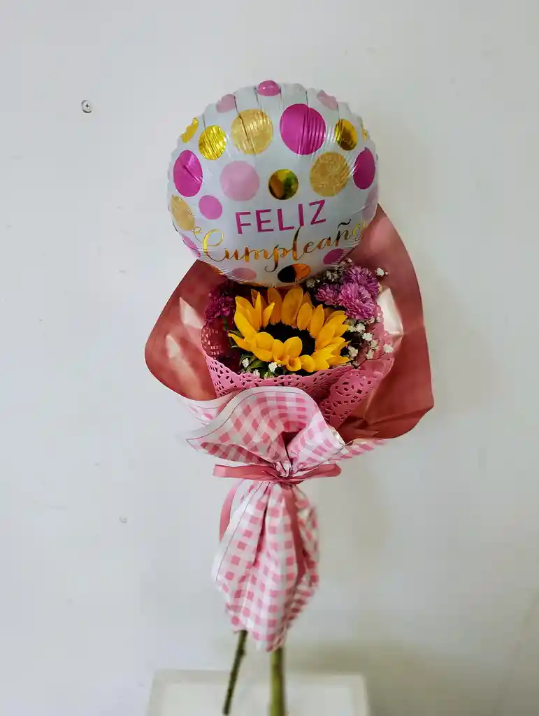 Girasol en mini ramo : Incluye : 1 Girasol y tarjetita de mensaje . Foto referencial no incluye globo . Sorprende con este sutil y delicado detalle
