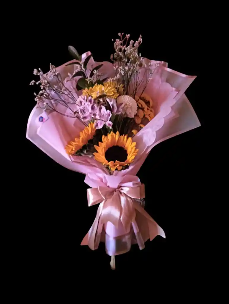 Descubre la elegancia del ramo Coquette, un impresionante ramo con dos girasoles decorados con flores de estación y follaje, envueltas en un delicado papel y decorado con un lazo de satén,