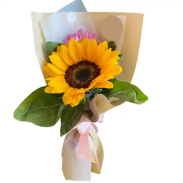 Ramo de 1 girasol, follaje y envoltura
