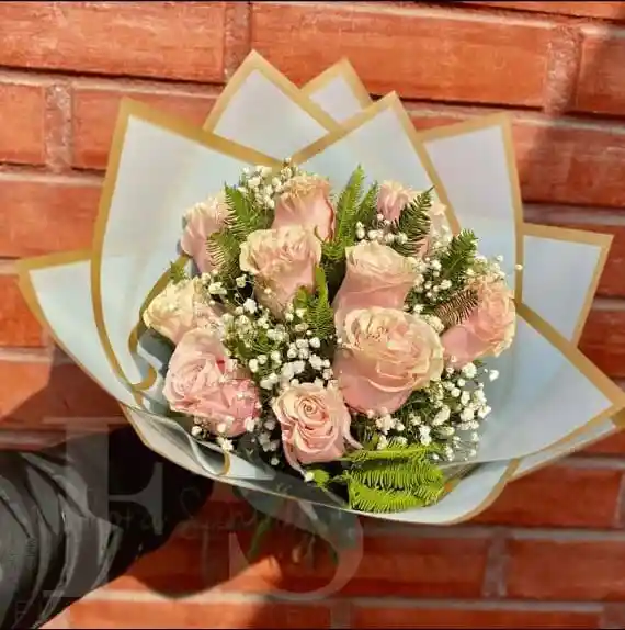Hermoso ramo de 10 rosas rosadas con gypso