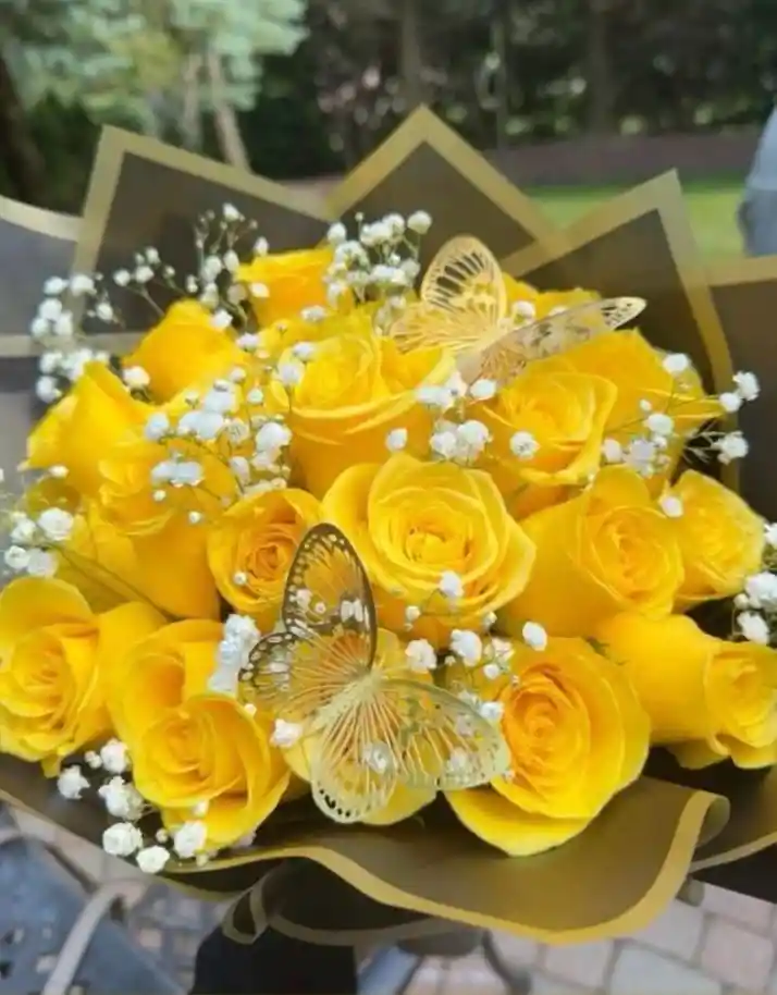 Hermoso arreglo de 12 rosas amarillas con mariposas y gypso