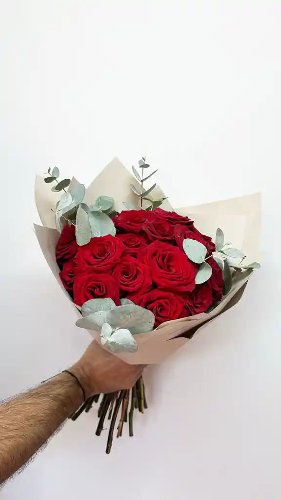 RAMO DE 20 ROSAS IMPORTADAS COLOR ROJO CON FOLLAJE DEL DIA