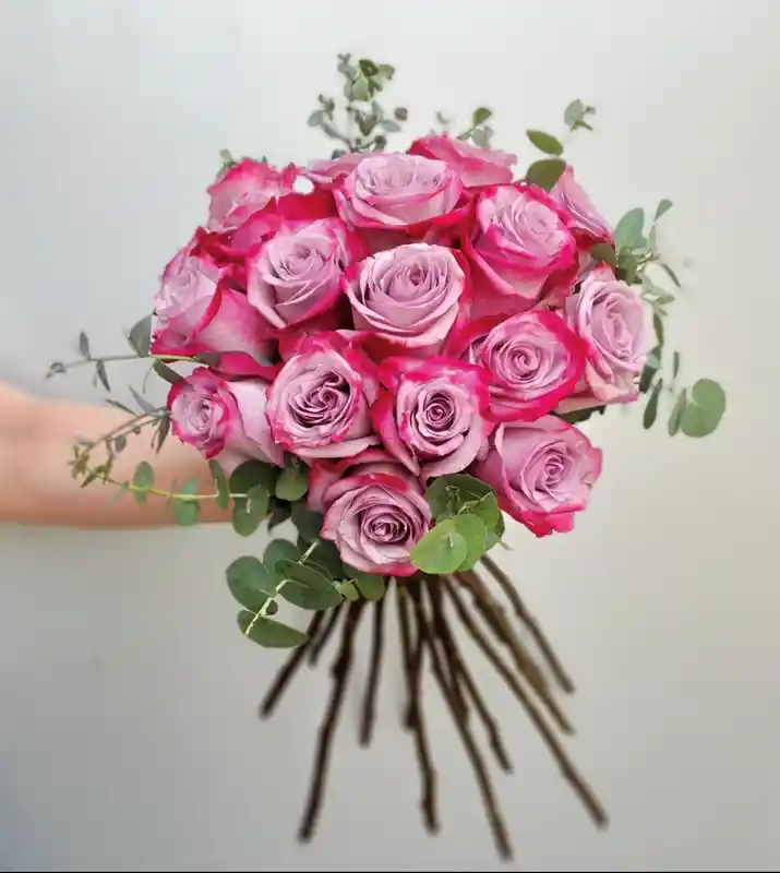 Ramo de 25 Rosas Lila Importadas más eucalyptus envuelto en papel y cinta de raso.