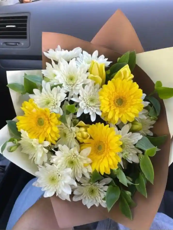 Hermoso ramo de 3 gerberas amarillas con maule blanco