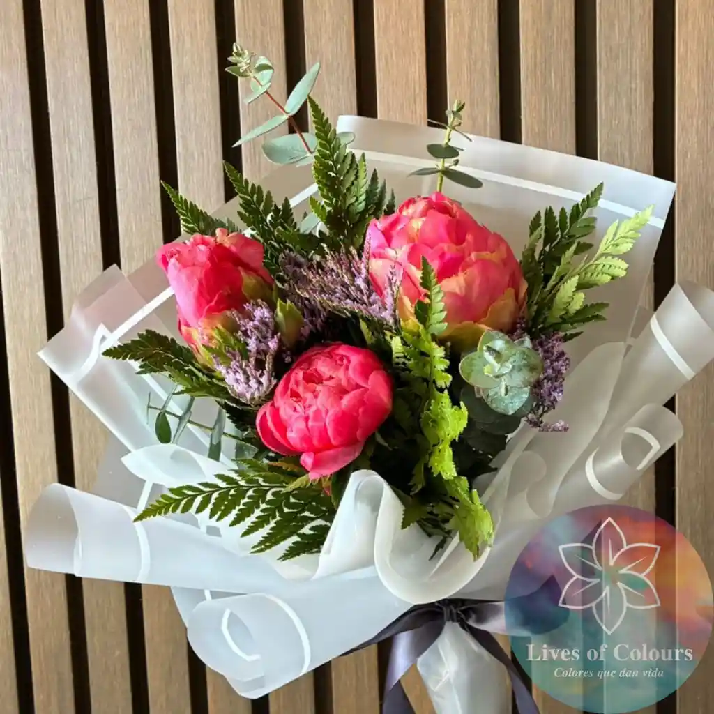 Hermoso ramo de 3 peonias demorado con toques de palmilla