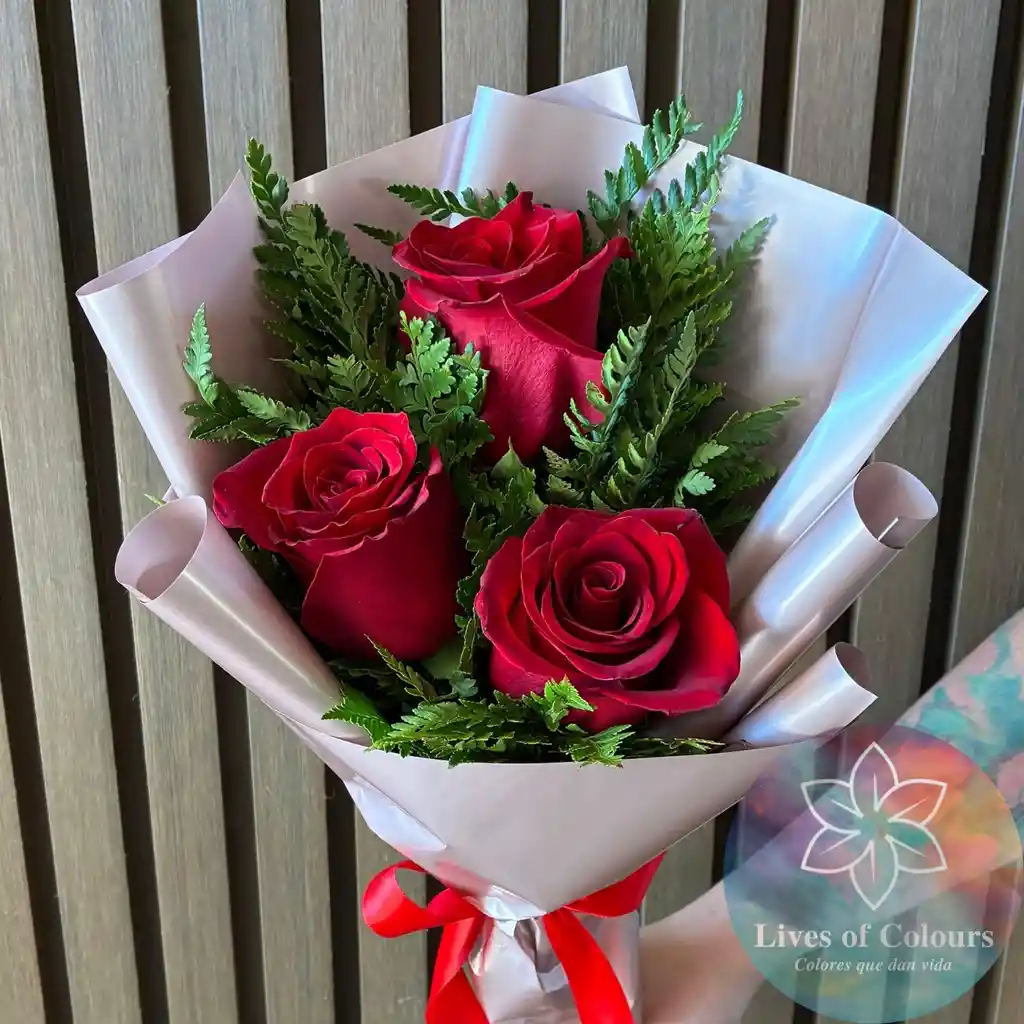 Ramo de 3 rosas rojas seleccionadas decorado con follaje silvestre