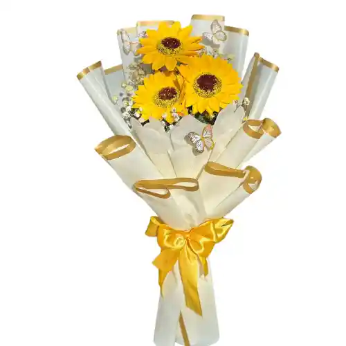 Ramo de 3 Girasoles de jabon con linda envoltura ✨ Ramo de flores de jabón ✨ ¡Hermosas, delicadas y duraderas! Estas flores no son naturales, están hechas a mano con jabón, ¡y mantienen su aroma y belleza por mucho tiempo!”