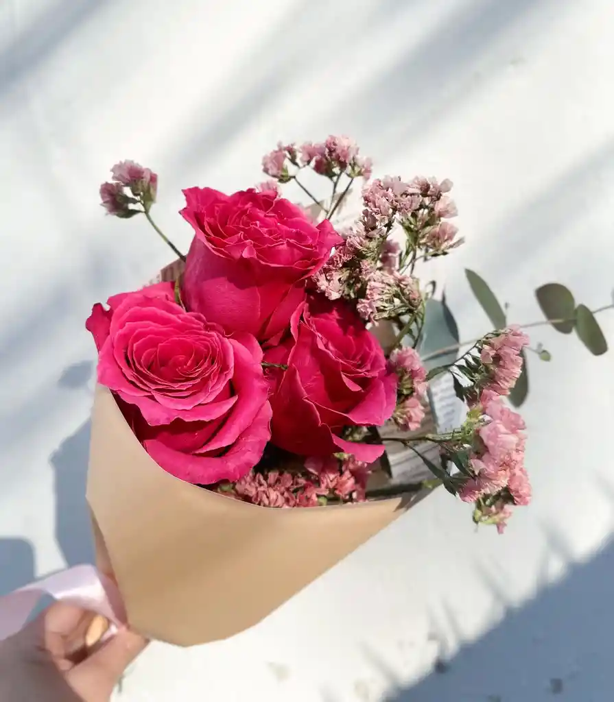 RAMO DE 3 ROSAS FUCSIAS CON FOLLAJE DEL DIA
