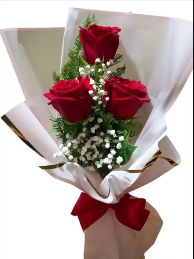 ramo de mano con 3 rosas rojas envuelto en gipsophilias, envuelto en papel koreano y cinta de raso
