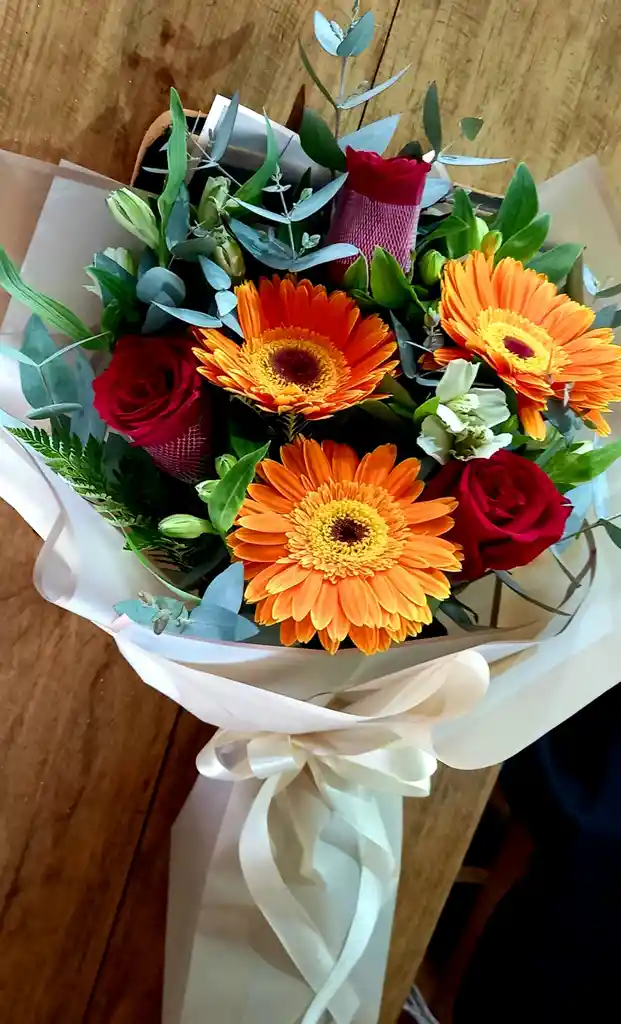 ramo de mano con 3 rosas rojas y 3 gerberas, color de gerberas puede variar según disponibilidad, en papel crema u otro, que combine.