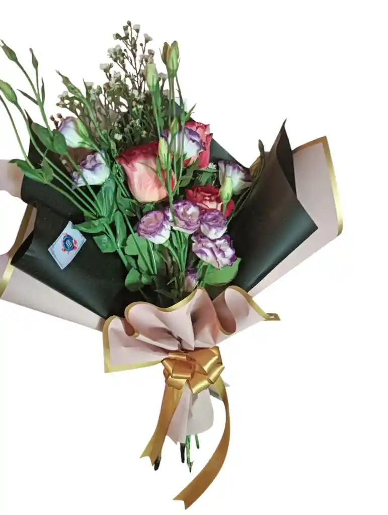 Ramo de 3 rosas y 3 Lisianthus con follaje, tonalidad según disponibilidad,