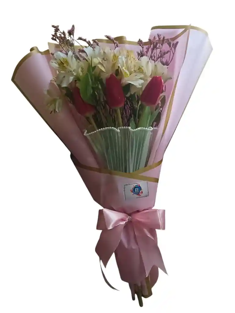 Hermoso ramo de 3 tulipanes con Astromelias que simbolizan el amor y gratitud para el ser amado.