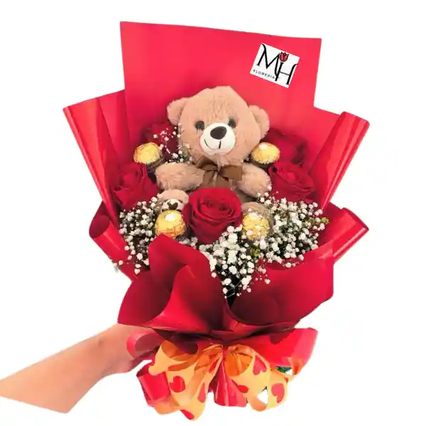 Ramo de 5 rosas, 4 bombones y peluche de 20cm