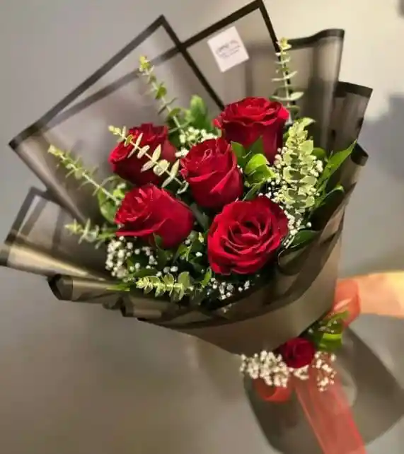Hermoso ramo de 5 rosas rojas con eucalypto y gyspso