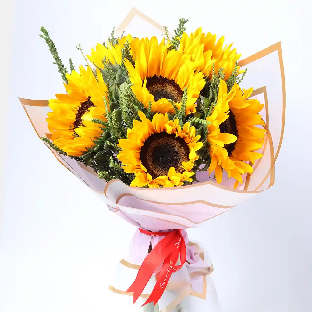 Ramo de 6 Girasoles Frescos 🌻 ¡Alegra el día de alguien especial! Hermoso ramo compuesto por 6 girasoles frescos de primera calidad, acompañados de elegante follaje verde que realza la belleza natural de estas flores radiantes. Características: 6 girasoles frescos y vibrantes Follaje verde decorativo incluido Envuelto en papel empavonado Cinta de satin como toque distintivo Perfecto para: Cumpleaños y celebraciones Sorpresas románticas Decoración del hogar Regalo de buenos deseos Momentos especiales Entrega el mismo día en Santiago Flores frescas seleccionadas cuidadosamente para garantizar la máxima duración y belleza. Los girasoles simbolizan alegría, vitalidad y energía positiva. ¡Un regalo que transmite felicidad instantánea! 🚚 Entrega rápida y segura 🌿 100% frescas y naturales