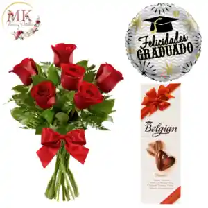 Ramo de 6 Rosas, Bombones Belgian y Globo