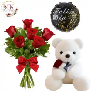 Ramo de 6 Rosas, Peluche 30cm y Globo