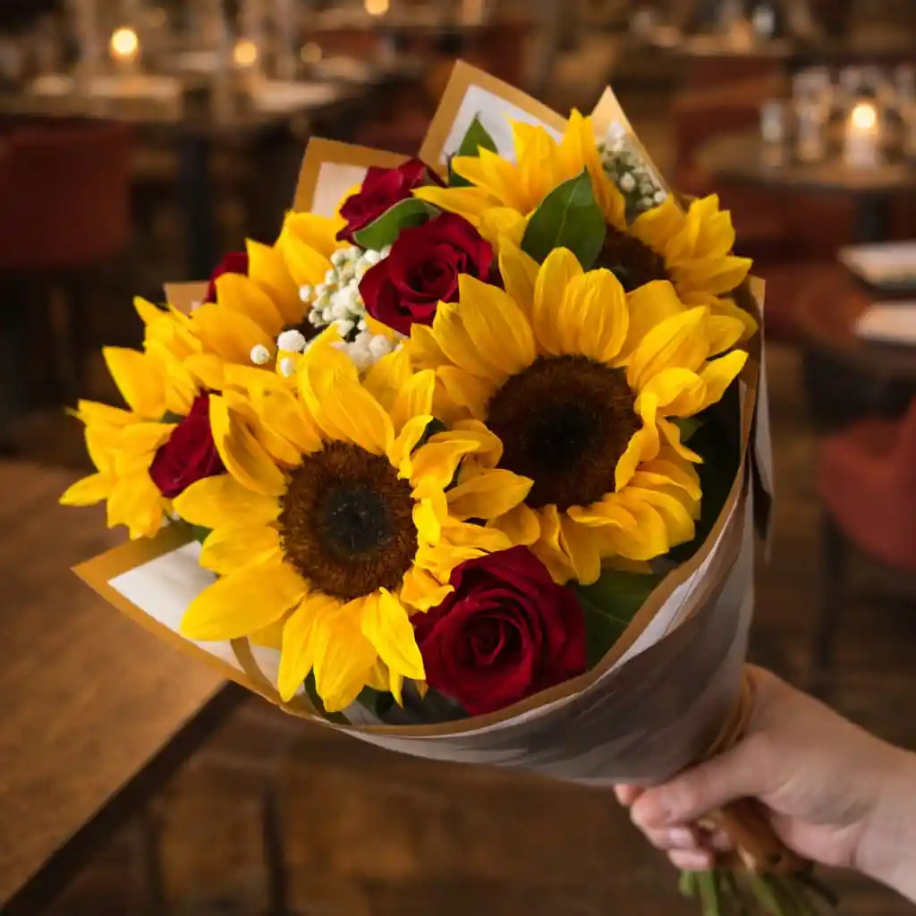 Contiene 22 Unidades. Ramo de Girasol 9 Und + Rosas 10 Und + Bombones Valentte 3 Und. Hermoso Ramo de un Girasol Con Rosas.