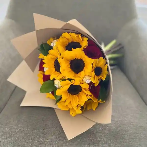 Contiene 22 Unidades. Ramo de Girasol 9 Und + Rosas 10 Und + Bombones Valentte 3 Und. Hermoso Ramo de un Girasol Con Rosas.