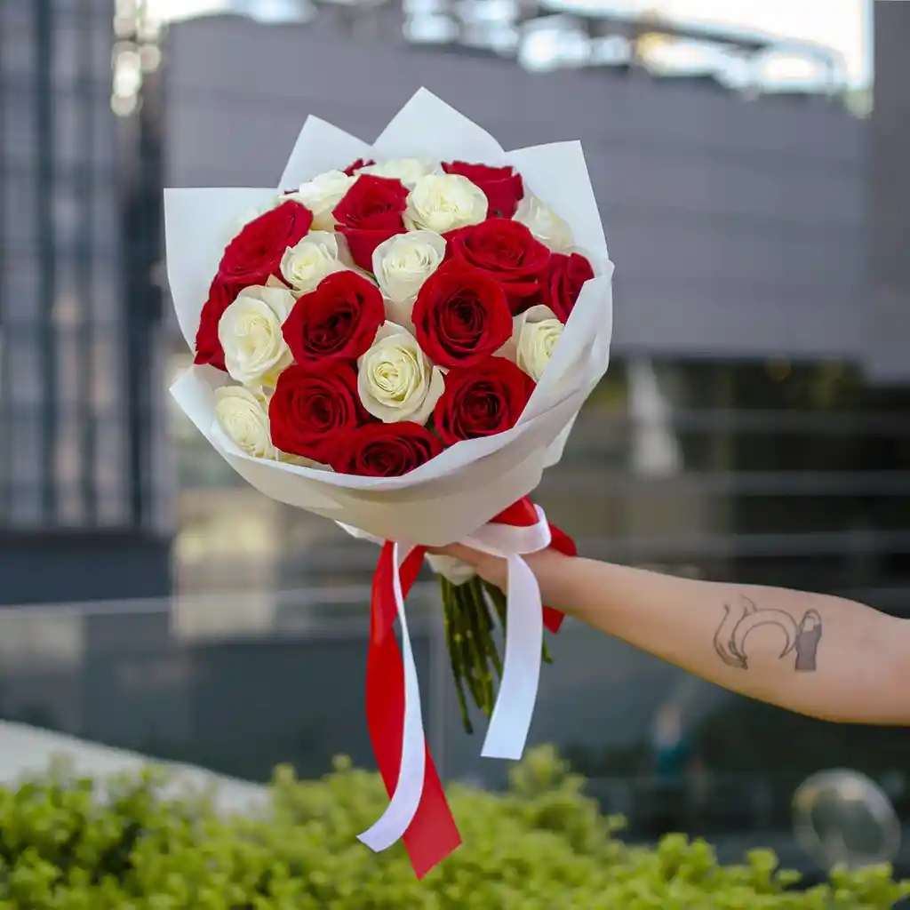 Clásico ramo de 12 rosas en dos tonos. Las flores son seleccionadas cuidadosamente por su aroma, frescura y calidad. Contiene: 6 Rosas rojas 6 Rosas blancas Nos reservamos el derecho de sustituir flores en función de la temporada y el stock disponible para mantener la frescura y calidad de nuestros productos. Confía en nosotras! Sabemos lo que hacemos