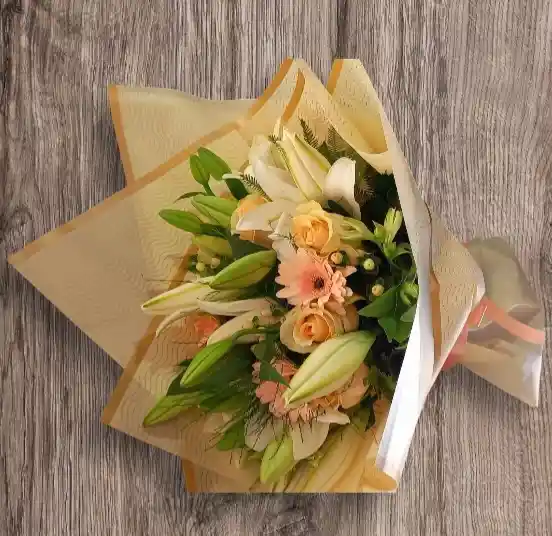 ramo de flores ´para toda eventualidad, en flores variadas en colores damasco suave