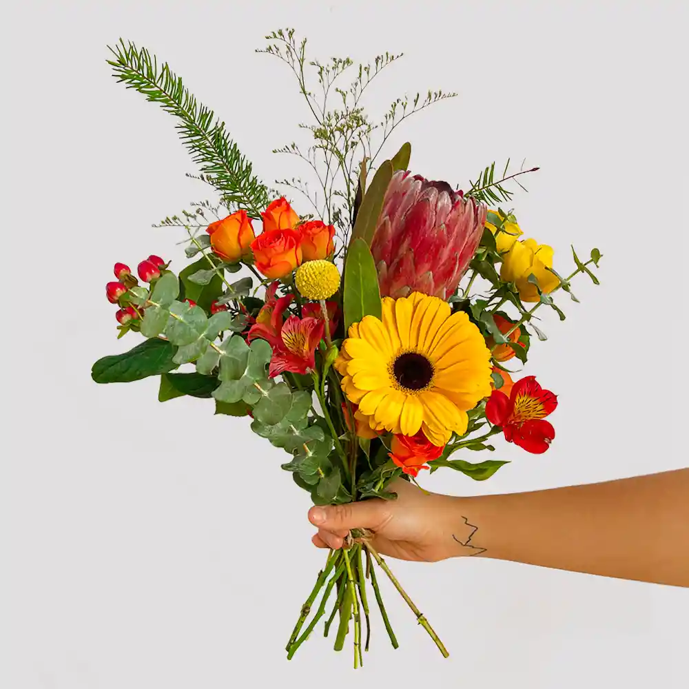 Original ramo diseñado especialmente para celebrar un momento importante. Las flores son seleccionadas cuidadosamente por su aroma, frescura y calidad. Contiene: Mini rosas Gerbera Alstroemerias Craspedia Hipericum Protea Follaje de temporada El arreglo puede sufrir modificaciones de acuerdo a la temporada en la que nos encontremos tomar esto en cuenta al comprar, durante el verano (Diciembre, enero, febrero) No contaremos con proteas y será cambiada por alguna de las flores que tengamos en stock. Nos reservamos el derecho de sustituir flores en función de la temporada y el stock disponible para mantener la frescura y calidad de nuestros productos. Confía en nosotras! Sabemos lo que hacemos