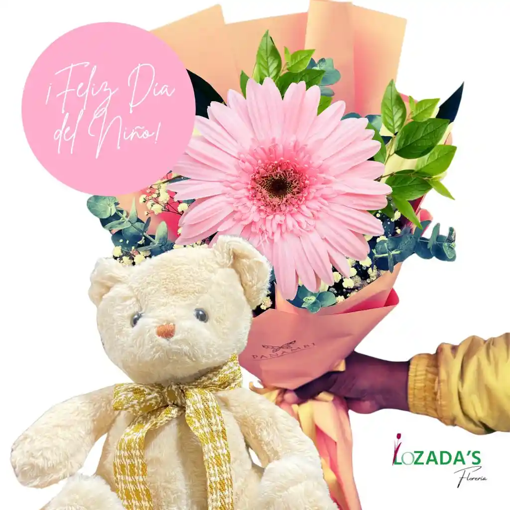 Regala esta hermosa gerbera rosada acompañada de un oso de peluche, ideal para cumpleaños, aniversarios o simplemente para hacer un detalle.