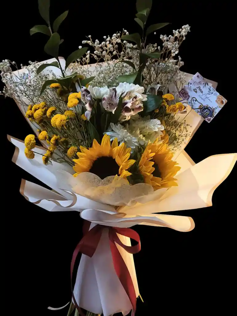 Hermoso ramo de girasoles con Astromelias, con follaje de estación y envuelto en papel de seda con cinta de satín en un delicado estilo paloma.
