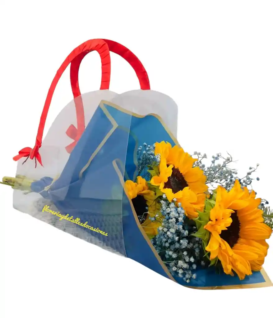 Ramo de 3 girasoles con envoltorio en papel coreano, incluye lindo estuche para flores.