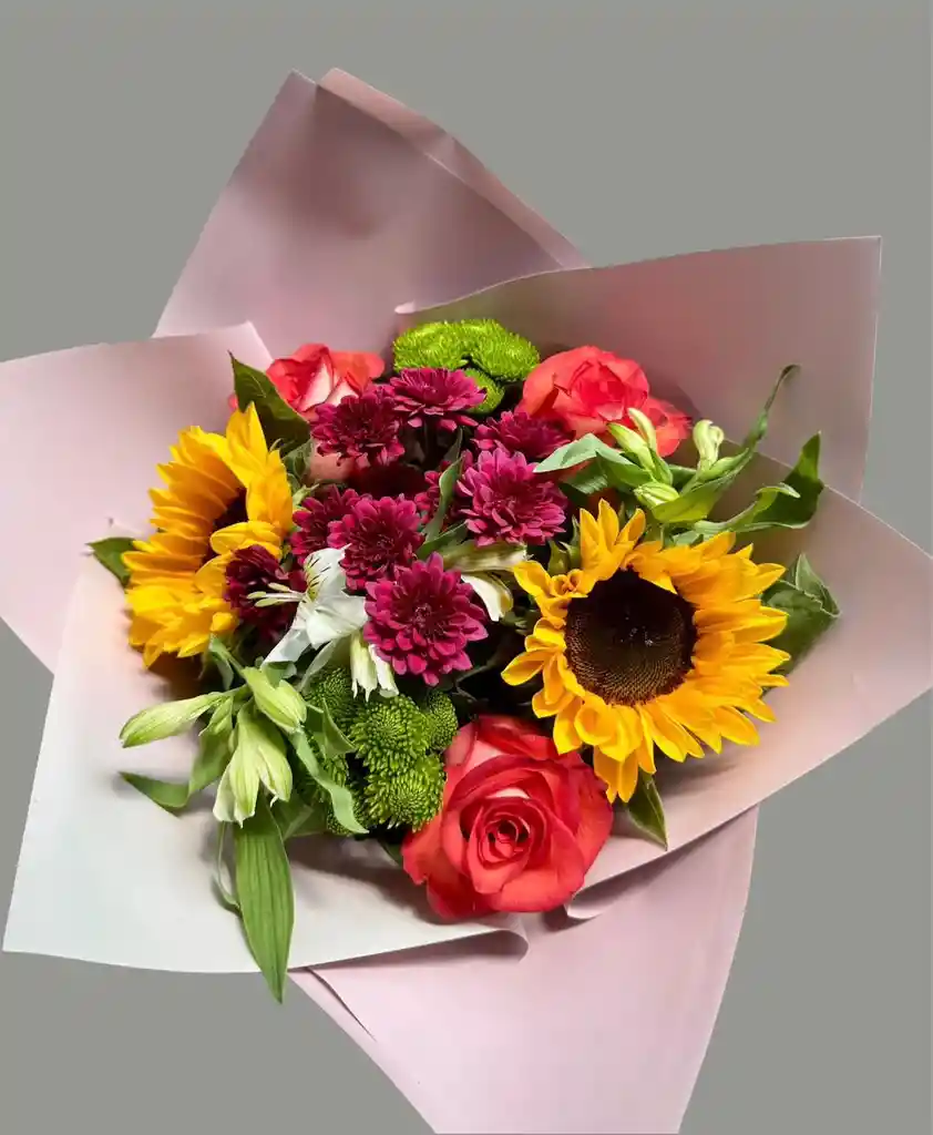RAMO DE LA SEMANA 3 ROSAS , 2 GIRASOLES ,MAULES Y ASTROMELIAS
