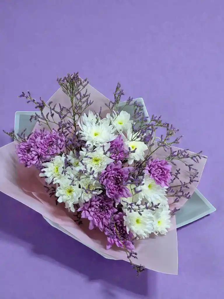 Ramo de maules morados y blancos acompañado de limonium