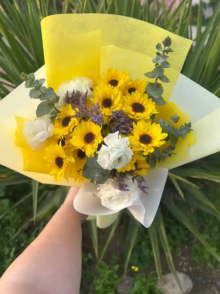 Hermoso ramo de maule y ranunculos con toques de limonio y eucalipto, Regalo ideal para sorprender a alguien el dia de hoy