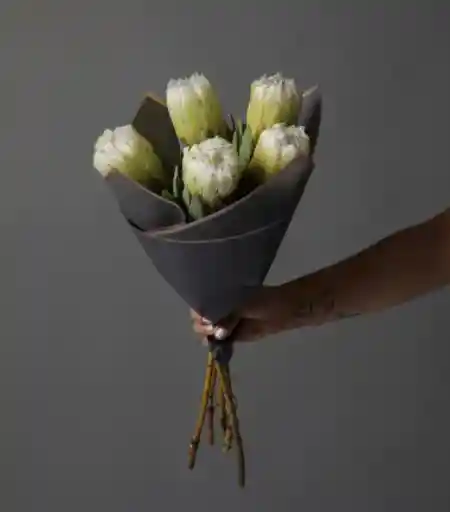 Este ramo incluye 5 varas de proteas mundii. Viene envuelto en papel e incluye tarjeta para escribir un mensaje si lo deseas.