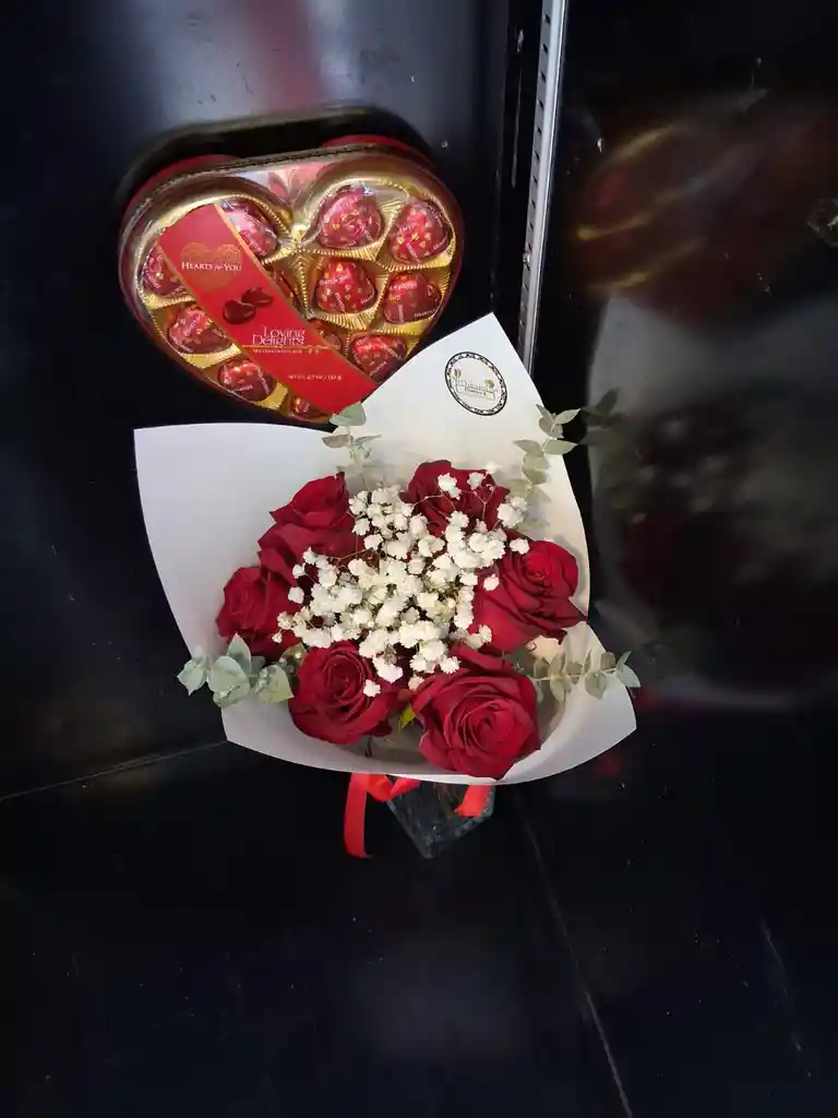 Ramo de 6 rosas rojas con gipsofilia envuelta en papel coreano mas corazon con bombones