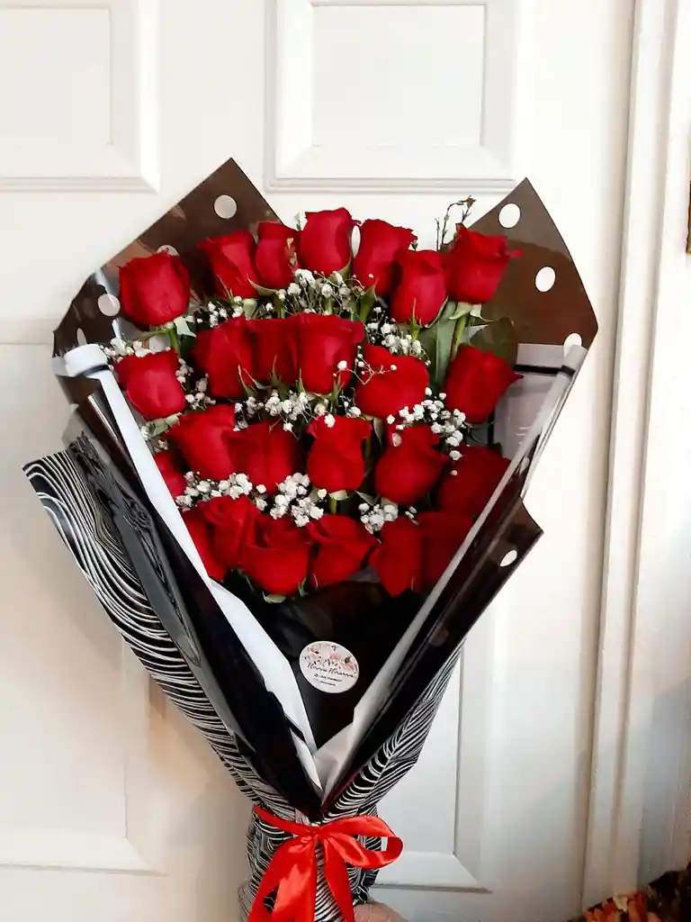 Ramo de 25 rosas ecuatorianas acompañado de ilusión además de papel decorativo