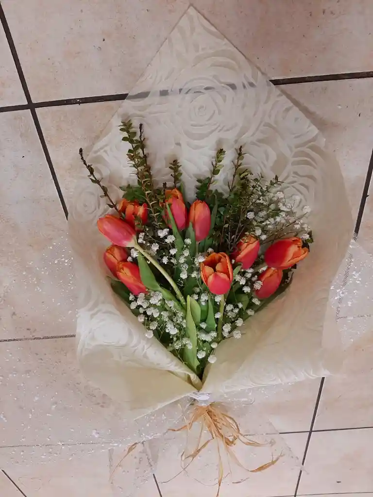 Ramo de 10 tulipanes en tonos anaranjados más un bonito envoltorio