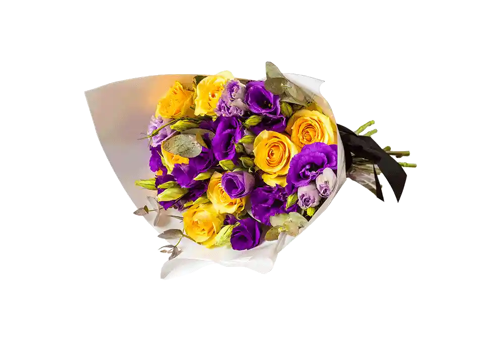 8 rosas importadas color disponible en tienda, flor de relleno color disponible en tienda, más ramas verdes de temporada. Trabajado con técnica de espiral, lleva cápsula de celofán para cubrir los tallos. Ramo envuelto en elegante papel blanco perlado y atado con cinta de raso opaco negro.
