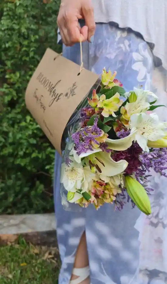 Ramo de flores frescas en un pack impactante. Selección de flores de temporada: tomamos una selección de 10 varas de las más lindas flores frescas disponibles en la temporada, entre ellas puede tener lisianthus y astromelias como flores principales. Además sumamos lilium, greenballs, gerberas, maules, entre otras flores frescas, dependiendo de la disponibilidad. En el taller creamos un ramo para impresionar a quien quieras. Ramo contiene entre 10 varas. El ramo se entrega dentro de este empaque fácil de llevar, listo para que lo puedas poner en un jarro o florero de tu casa (no incluído). Además, incluiremos un sobre de alimento para flores! Recuerda sumar un mensaje que escribiremos a mano e incluiremos en una tarjeta junto a las flores.
