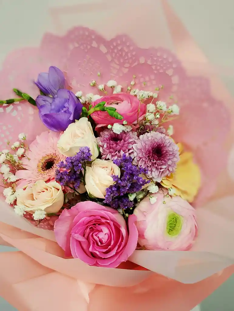 Ramo de la Novia Sorprende con este delicado mini ramo con hermosas y finas flores . Incluye : 2 Gerberas, 2 Ranúnculos, 1 Fresia , 1 Rosa rosada . Tarjetita de Mensaje envoltorio delicado con tratamiento de humedad