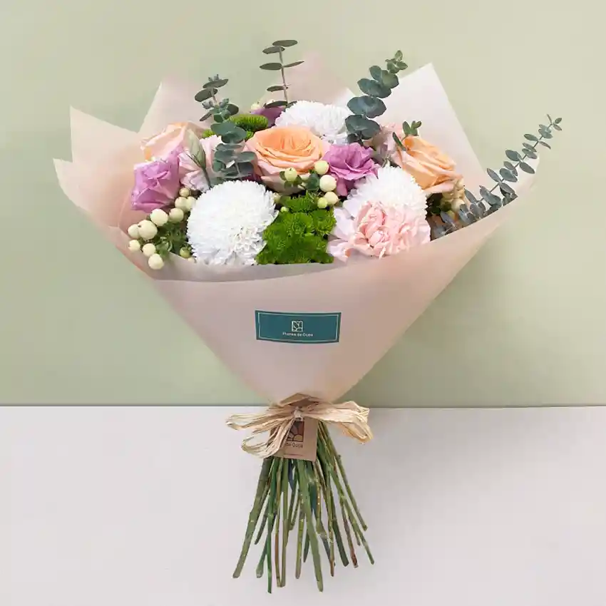 Ramo de flores compuesto por el encanto de las Rosas, Disbud ball e hypericum en complemento con detalles de otras variedades de flores y follaje disponible. Sorprende a tu amor con este hermoso ramo de flores!