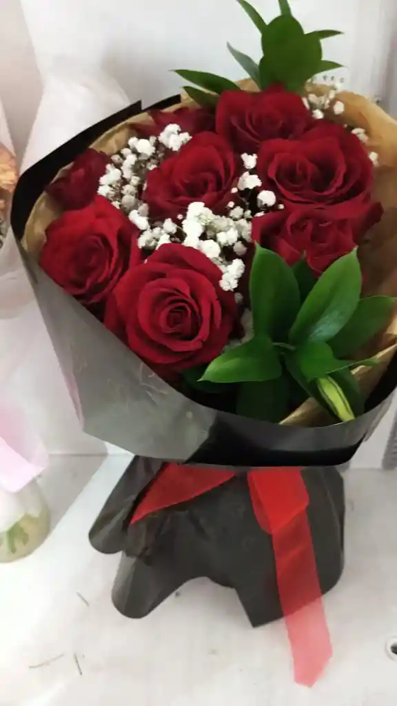 Ramo de 10 Rosas rojas con gipsophilia y ruscus, envuelto en papel coreano.