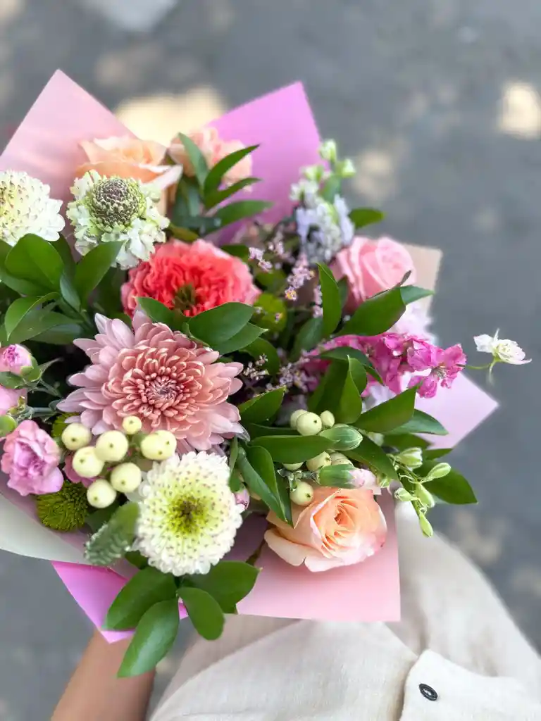 Este Ramo es uno de nuestros Best Sellers, incluye un mix de 30 a 35 varas entre flores frescas y follajes del día envuelto en papel del día. Sorpréndete con la paleta de color del día, nosotros elegimos por ti las flores más lindas y frescas