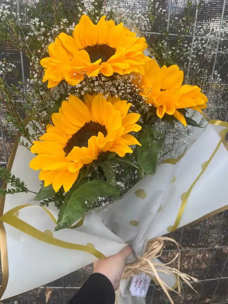 Ramo esperanza. Incluye 3 girasoles y follaje verde presentación en papel de arroz amarrado con rafia.