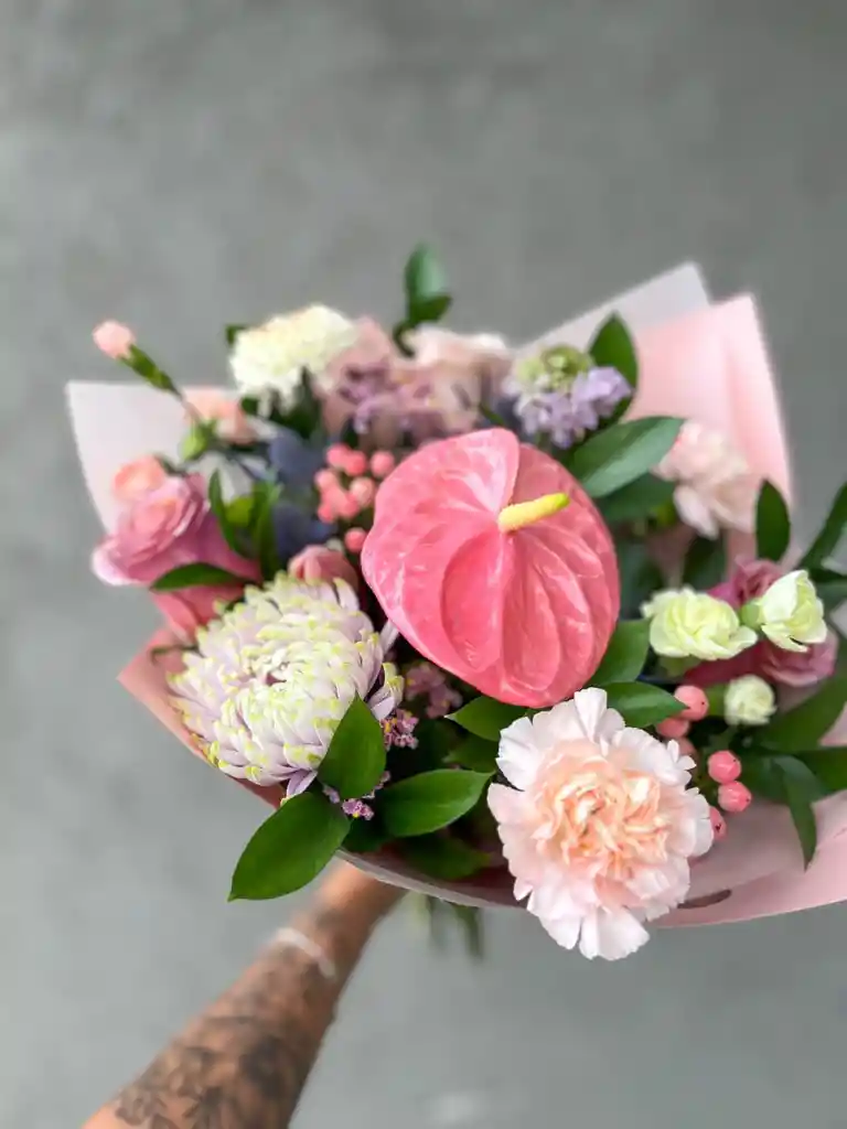 Incluye: 1 vara de anturium rosada Entre 15-20 varas entre de flores y follajes del día Todo en la paleta de color del amor envuelto en papel del día.