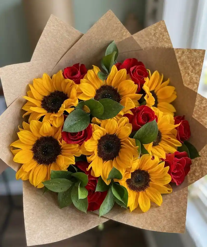 RAMO FLORAL GIRASOLES CON ROSAS ROJAS