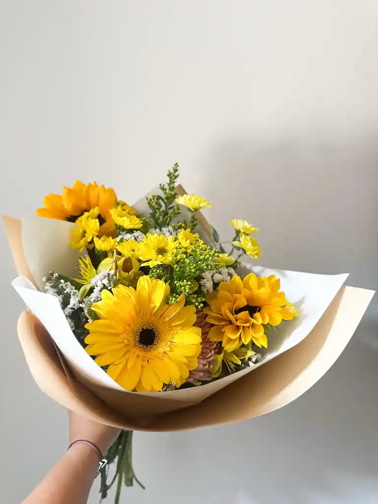 BELLO RAMO DE 12 VARAS DE FLORES MIXTAS EN COLOR AMARILLO CON FOLLAJE
